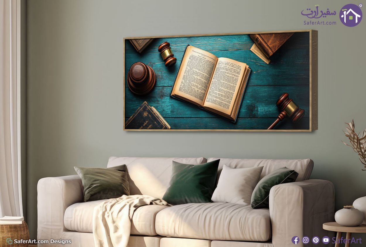 لوحة فنية تجسد وقار القانون والعدالة من خلال تصوير مطرقة القاضي والكتب القانونية القديمة المفتوحة على خلفية خشبية زرقاء بأسلوب تصوير فوتوغرافي واقعي دقيق يبرز الملامح والتفاصيل العميقة ليكون ضمن اجمل تابلوهات ديكور كلاسيكية تناسب مكاتب المحاماة والشركات الكبرى لإضفاء لمسة من الرقي والهيبة على المكان بشكل احترافي ومميز جدا, متوفر بمقاسات متعددة يمكنك اختيار او تغيير المقاس عند الطلب ,بتصميم مميز لـ تابلوهات مودرن, تابلوهات مودرن , لوحات فنية مودرن اعمال و شركات, قانون - قضاء - محاماه , التابلوه يغلب عليه الالوان ازرق - تركواز, الوان داكنة, بنى - بيج , و مصمم بالشكل التالى 1 قطعه , بالعرض, ببرواز, مستطيل , مناسب لديكور حوائط مكاتب – شركات - اعمال , و هو يتميز بالسمات التالية : صور فوتوغرافية, عتيق - فينتاج, مودرن , متوفر الان فى مصر و يأتى جاهز للتركيب مع دليل التركيب و اكسسوارات التركيب اللازمه